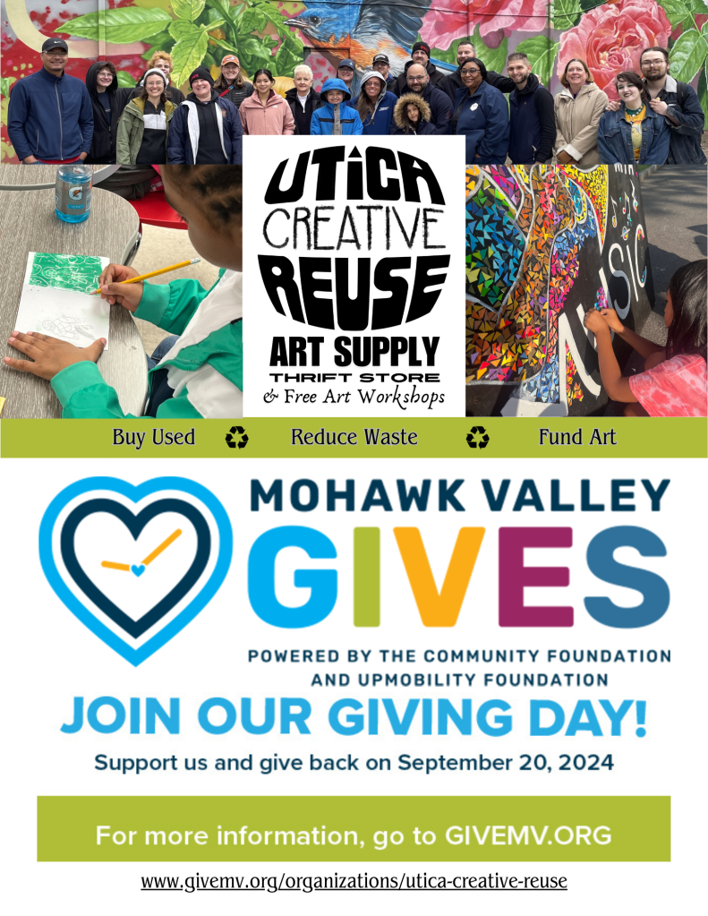 Mohawk Valley Gives is a community-wide fundraising effort to support local nonprofit organizations. To participate, visit www.givemv.org this week and make a donation to Utica Creative Reuse and/or to any of the great participating nonprofit organizations in Mohawk Valley.